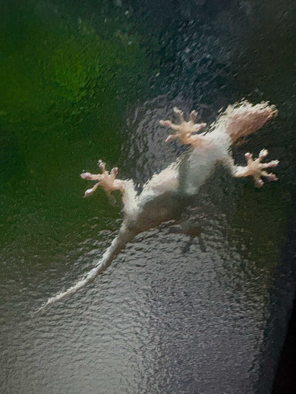 ちなみに自宅にもいます。こちらの写真はすりガラス越しに見たヤモリです。