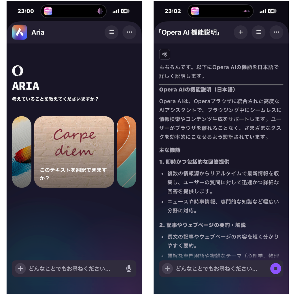 今後は「Opera AI」で統一されると思われるので。チャットで例えば機能の説明を質問する時は「Opera AI」の方を使用した方が良いです。「Aria」で質問しても、様々な名称で使われてる「Aria」の説明しか返ってこなかったので。😅